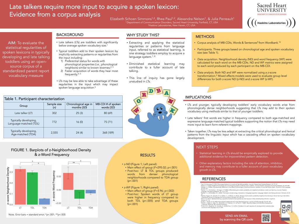 Poster Presentation: American Speech-Language Hearing Association Convention (2021; two student co-authors, one undergraduate and one graduate student) Share this: Click to share on X (Opens in new window) X Click to share on Facebook (Opens in new window) Facebook Like Loading...