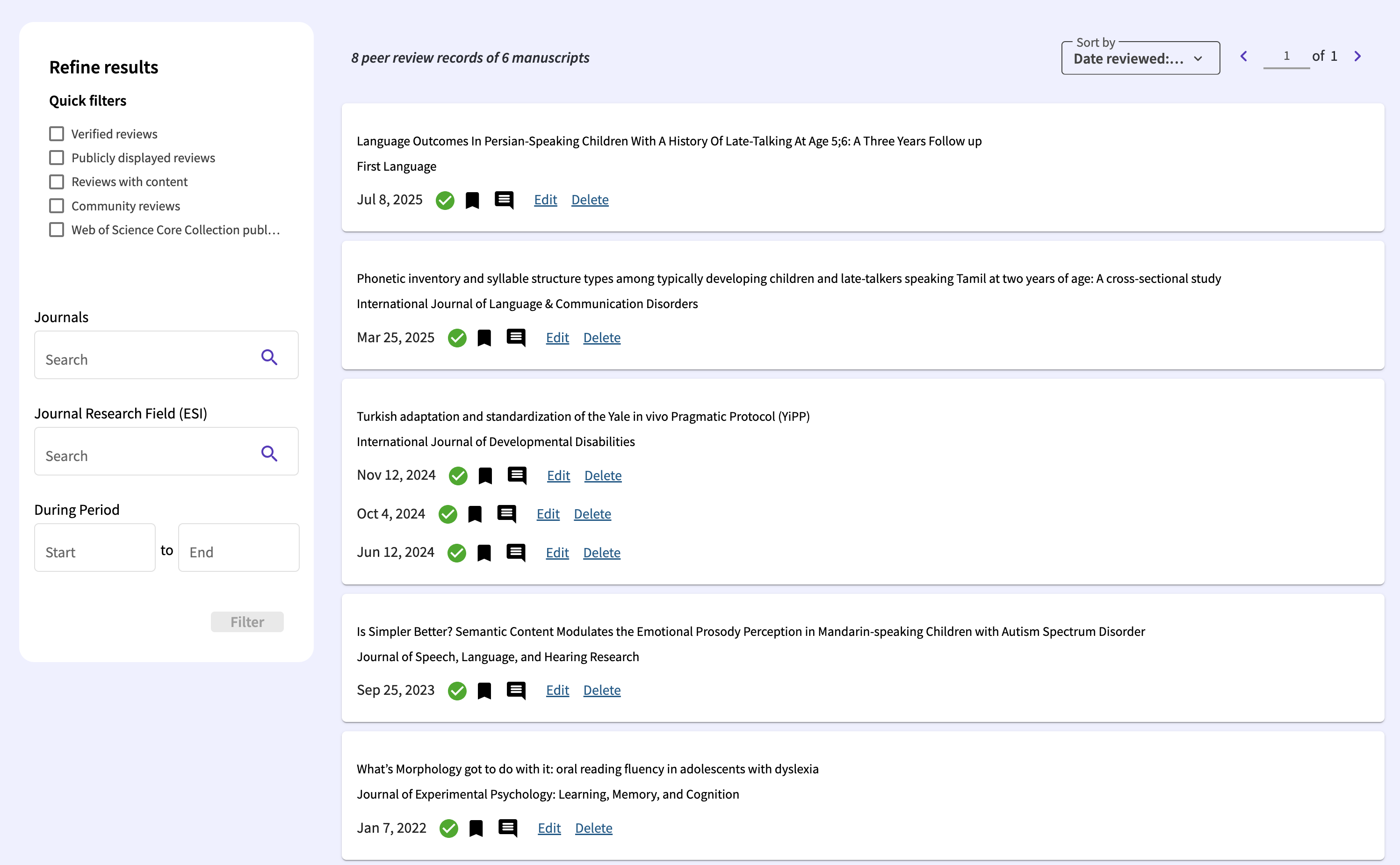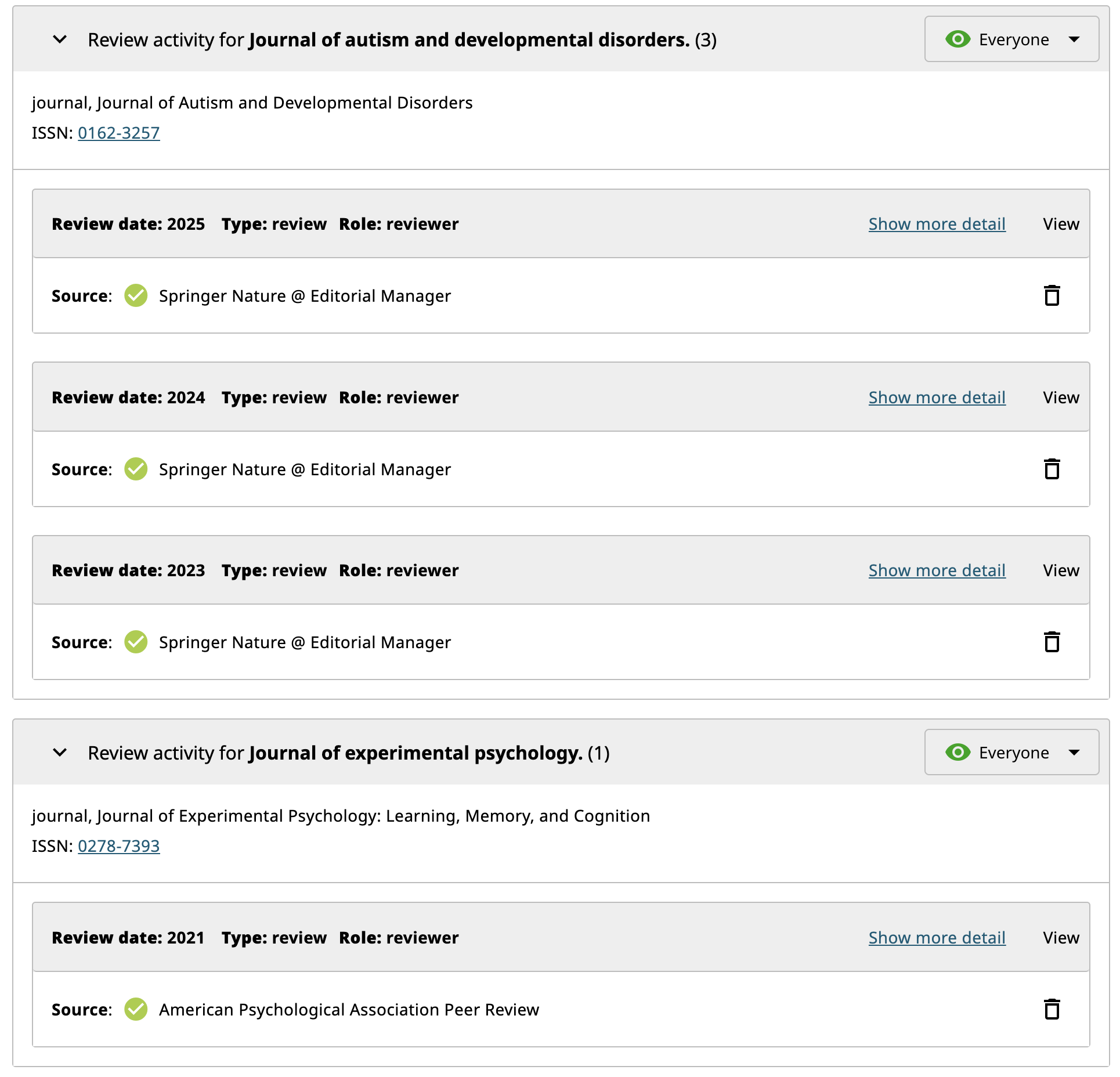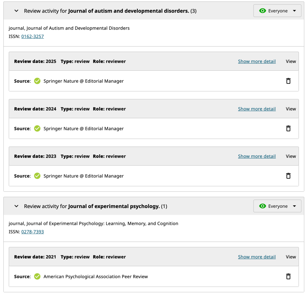 Some peer-reviewed journals provide recognition for reviewing manuscripts. Below is a subset of reviews I have completed as verified by Web of Science (webofscience.com) and ORCiD (orcid.org).