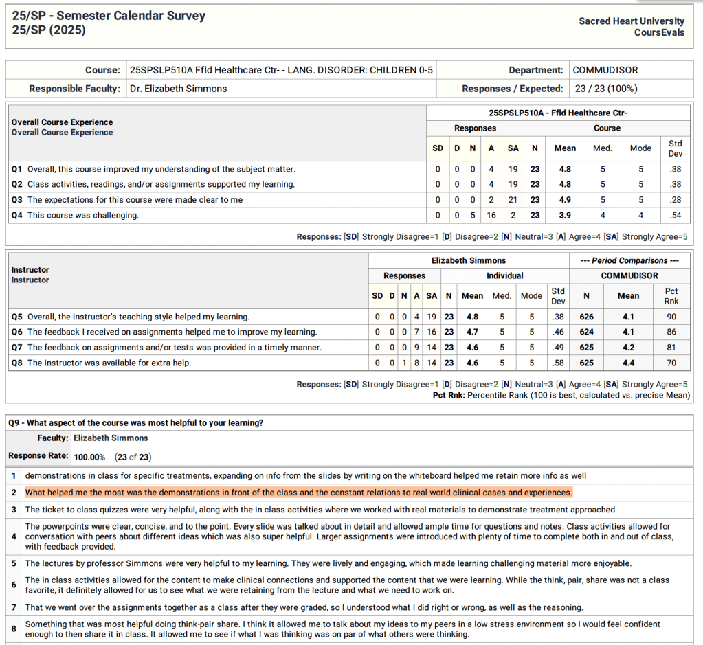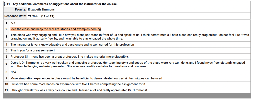 Students’ positive responses to personal clinical stories (Spring 2025; SLP 510): Highlighted in orange Share this: Click to share on X (Opens in new window) X Click to share on Facebook (Opens in new window) Facebook Like Loading...